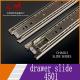 45mm Full extension drawer slide Model: 4501 1.Applications: Kitchen,office or home cabinets. 2.Features: 32mm hole pattern,full extension and handed lever disconnected. 3.Load rating: 45kg(99lbs)/18"(450mm) 4.Material: Cold rolled steel 5.Length:10"-24"/250mm-600mm 6.Width/height: 45mm 7.Thickness: 1.0×1.0×1.2mm or 1.2×1.2×1.5mm 8.Finish: Zinc plated or black 9.Certificate: SGS, pass 50,000 times cycling test[...]